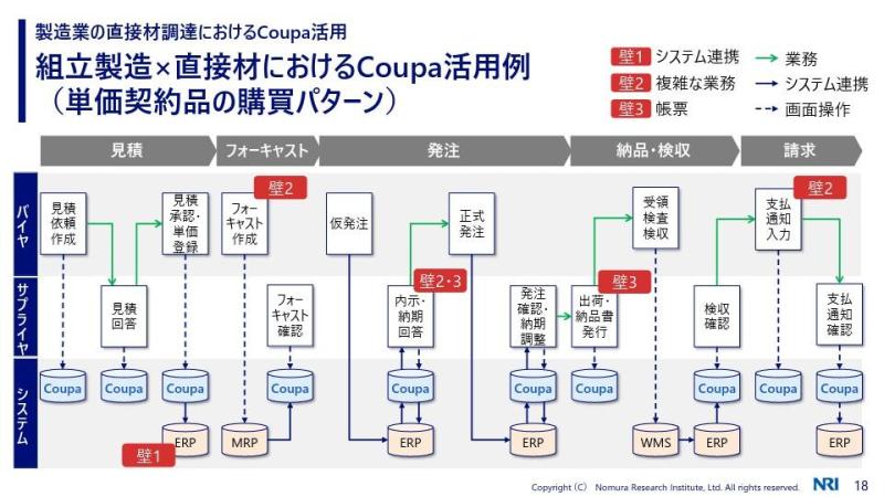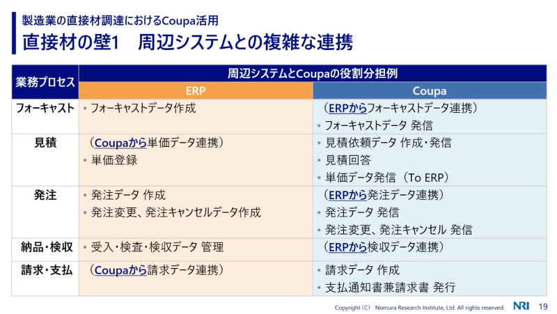 これまでCoupaでの直接材調達の実現には、周辺システムとの連携や直接材特有の業務、多様な帳票のニーズといった「壁」がありました。しかし、Coupaの新機能とNRIのナレッジによりそうした「壁」を乗り越え、実現が可能になったと田畑氏。