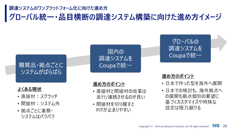まず、直接材と間接材、あるいは拠点ごとに業務やシステムがバラバラな現状から、国内の調達システムをCoupaで統一します。このとき「間接材を切り離すとプロジェクトが止まりがちになるため、直接材と間接材の改革は並行または連続させるのがよい」と田畑氏。